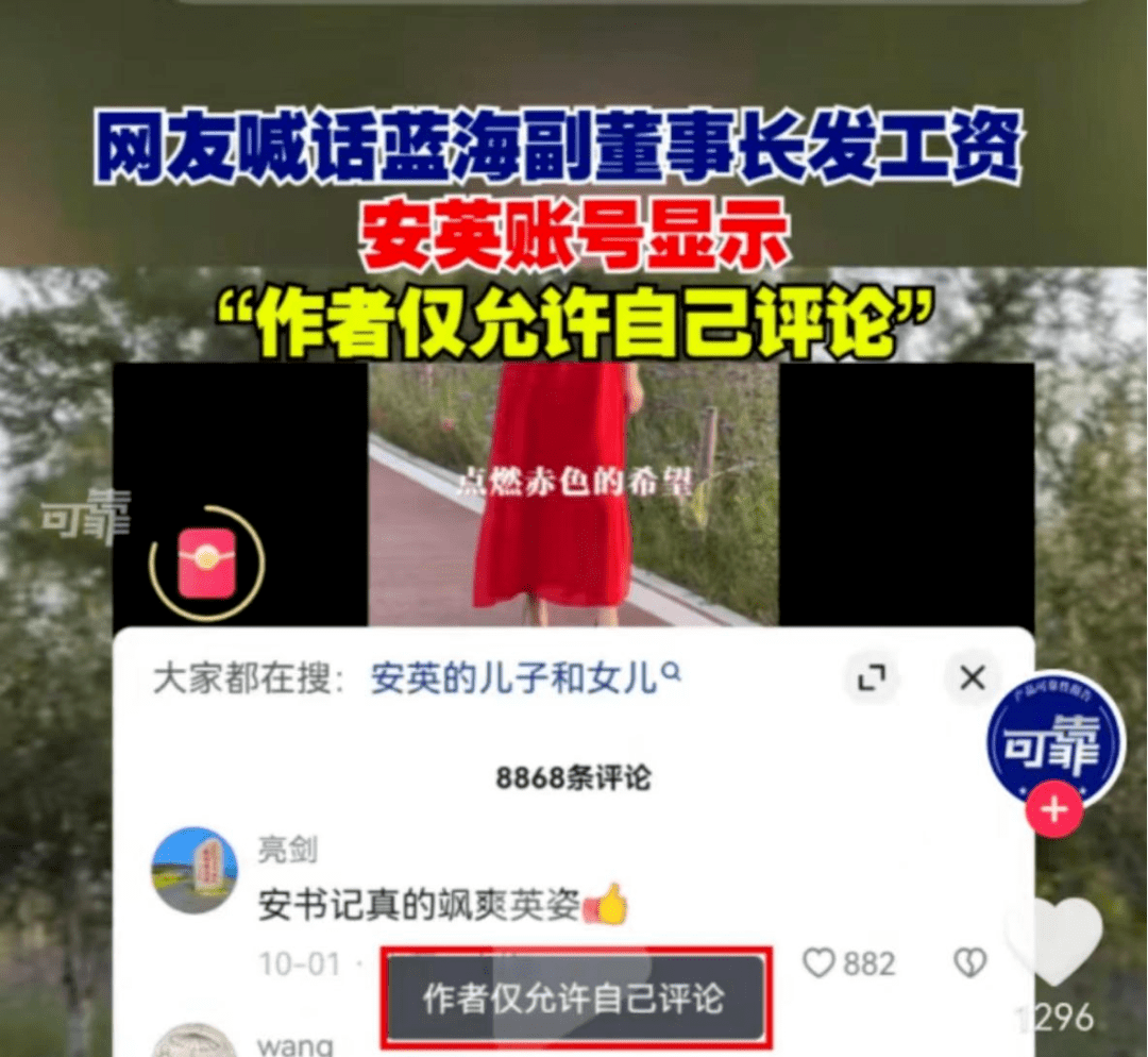 安英曾是蓝海集团的党委书记,现抖音认证信息为副董事长。她在平台上营造的阳光、热情、知性的成熟职业女性形象,收获了诸多粉丝和积极向上的回应。在欠薪传闻爆发之后,她调整抖音账号评论设置,最新内容设为“仅自己评论”,试图以此维护自身的体面形象。