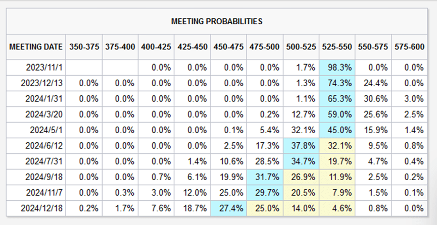 芝商所美联储观察工具显示,11月和12月不加息的概率分别高达98%和74%。