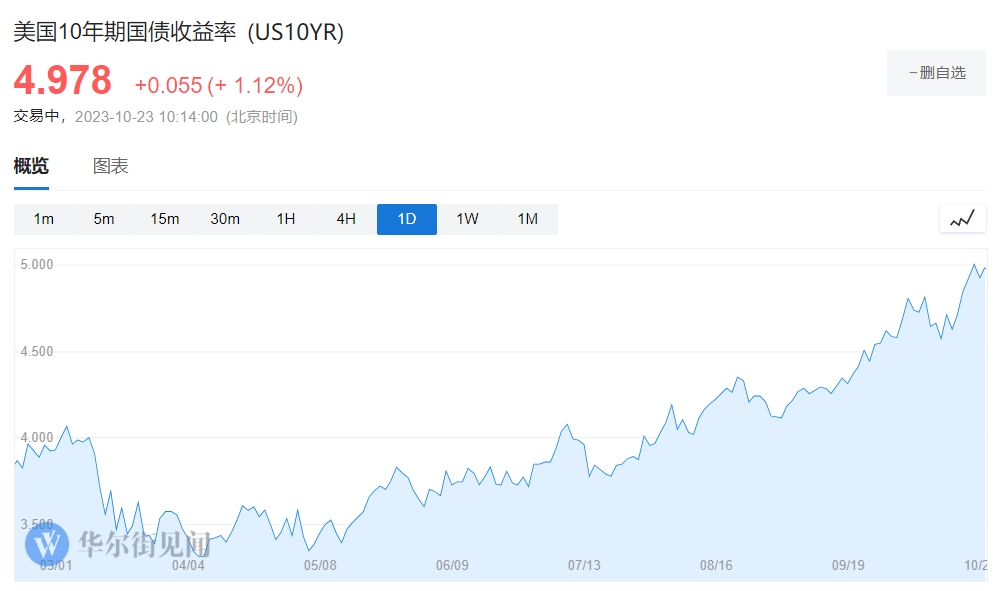 美债抛售浪潮自夏季以来一直在继续,长端收益率战况尤为惨烈。上周四,10年期美债收益率直逼5%,创下2007年以来的最高纪录,比7月低点上涨了约125个基点。