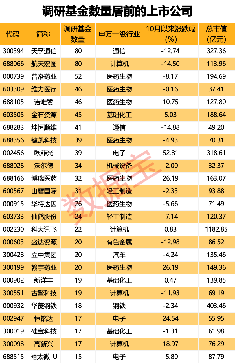 从参与调研的基金公司家数来看,10月以来,18家上市公司获得20只及以上的基金扎堆调研。天孚通信、航天宏图、普洛药业调研基金数目居前。