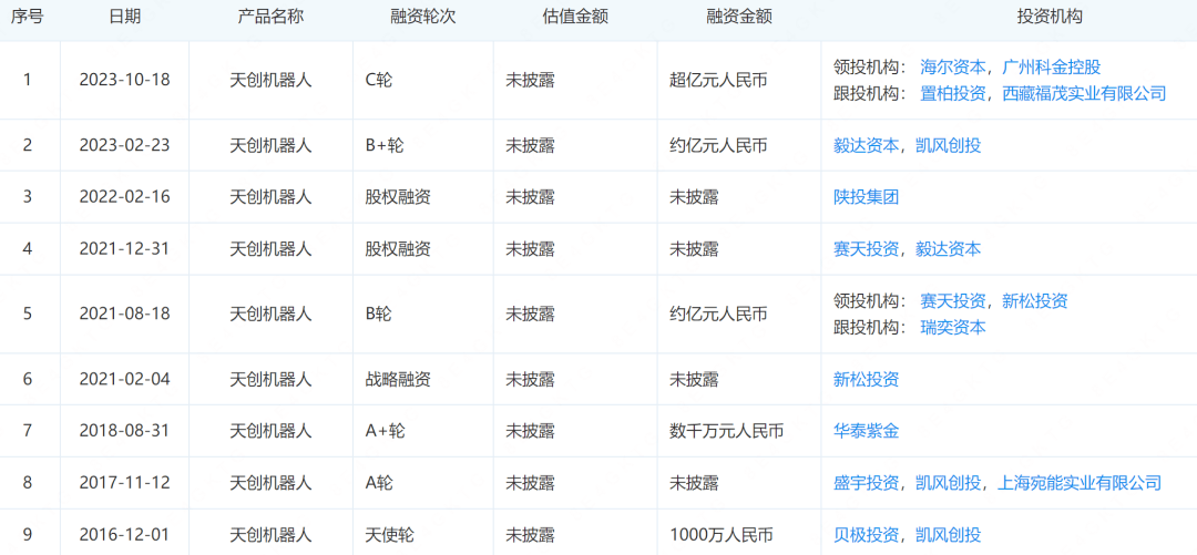 企查查数据显示,目前天创机器人已完成多轮融资,得到毅达资本、新松投资、凯风创投、海尔资本等10多家投资机构的青睐与支持,企业估值过10亿元。