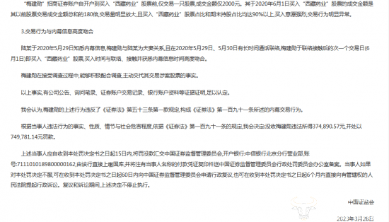 上述行为属于违规内幕交易行为,因此中国证监会对梅建勋处以了没收违法所得并罚款74.98万元的处罚。