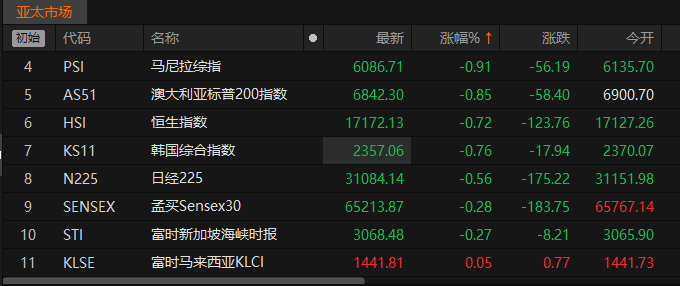 上证报中国证券网讯 据Choice金融终端数据,10月23日午间,亚太市场主要股指跌多涨少。截至北京时间13时,澳大利亚标普200指数跌0.85%,报6842.30点;韩国综合指数跌0.76%,报2357.06点;日经225指数跌0.56%,报31084.14点;富时马来西亚KLCI指数涨0.05%,报1441.81点。
