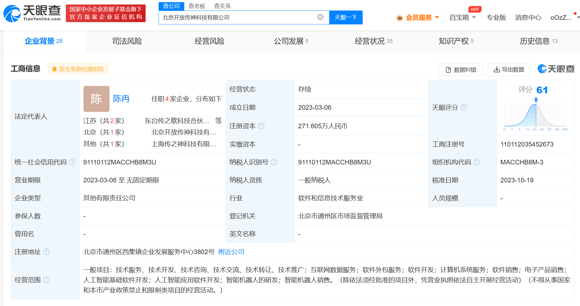 北京开放传神科技有限公司成立于今年3月,法定代表人为陈冉,经营范围含互联网数据服务、软件开发、电子产品销售、人工智能基础软件开发、智能机器人的研发等。据报道,今年9月,大模型研发公司OpenCSG获得联想创投集团、北京国信中数投资管理有限公司阶段性联合领投的数千万元天使轮融资。