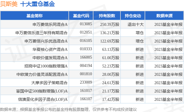 重仓贝斯美的前十大公募基金请见下表: