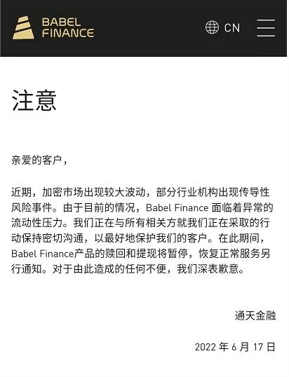 2022年6月17日,总部位于香港的数字货币贷款公司贝宝(Babel Finance)宣布因“异常的流动性危机”,暂停产品赎回和提币。“吴说区块链”曾报道称,贝宝的核心模式,就是以低成本吸纳资金,再加杠杆购买比特币,而其自有资金与客户资金无法完全分开。