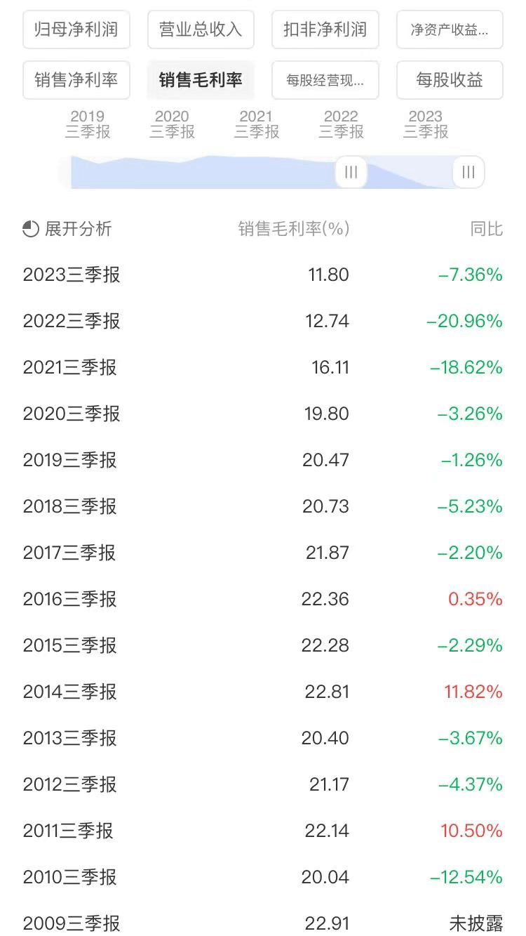 整体毛利率方面,2023年前三季度为11.8%,系2009年以来的最低值(即创下近14年来的新低)。