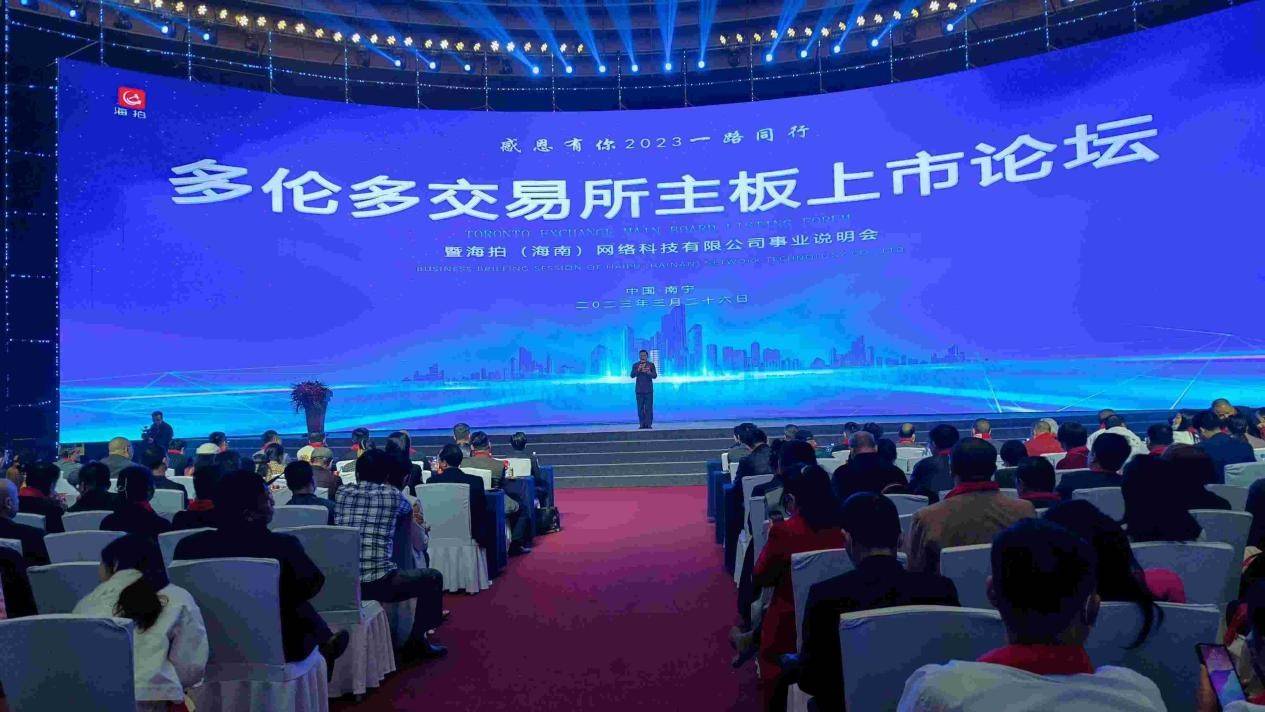 3月26日,海拍(海南)网络科技有限公司在广西南宁国际会展中心朱槿花厅举行加拿大多伦多证券交易所主板上市论坛暨事业说明会,来自国内外的上市辅导机构、券商、投资机构、商协会、法务届、新闻媒体代表和260多家合作企业的近800位嘉宾出席。