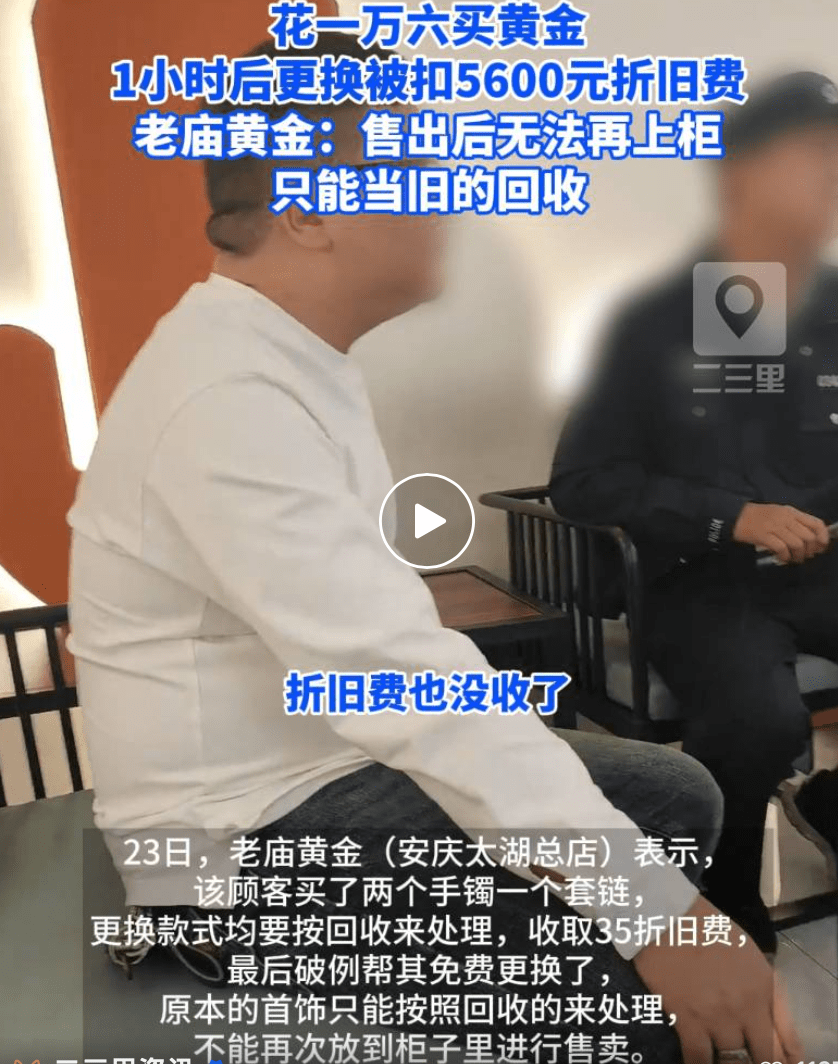 近日,安徽安庆,一顾客称自己16000买的黄金没拆封,到家还没有一个小时,去店内换款式店员说需要收35%的折旧费,大概5600元,随后和店家和顾客起了争执,最后顾客报警。10月23日,老庙黄金(安庆太湖总店)表示,该顾客买了两个手镯一个套链,更换款式均要按回收来处理,收取35折旧费,最后破例帮其免费更换了,原本的首饰只能按照回收的来处理,不能再次放到柜子里进行售卖。