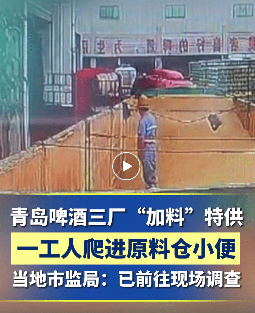 据媒体报道,10月19日,有网友发布视频称,山东青岛啤酒三厂,一工人爬进原料仓小便。