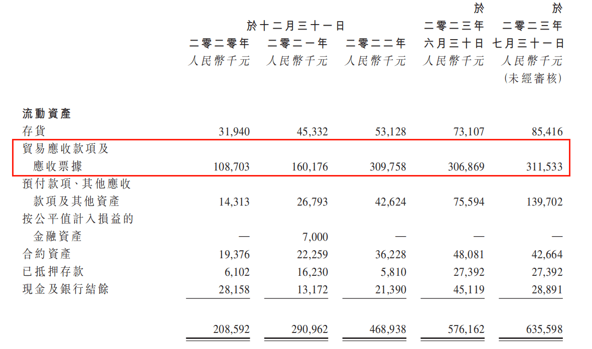 招股说明书显示,2020-2023年6月底,瑞昌国际整体的贸易应收款项分别为:1.09亿元、1.6亿元、3.1亿元和3.07亿,整体增长了182%。而在这其中,分别约有49.6%、48.5%、78.6%和75%的贸易应收款为与前五大客户发生的业务所产生。
