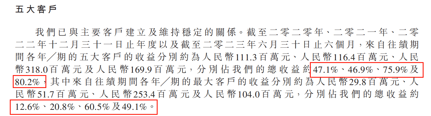 其中来自前五大客户的业务收入分别占到了总收入的47.1%、46.9%、75.9%和80.2%。占比逐年提高,同时,来自第一大客户的业务收入在2023年上半年达到了49.1%,占到了半壁江山,收入集中度以及对大客户的依赖程度可见一斑。