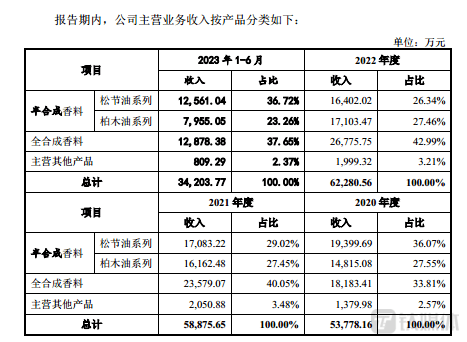 从产品上看,格林生物主要拥有半合成香料(松节油系列、柏木油系列)、全合成香料等,具体情况如下: