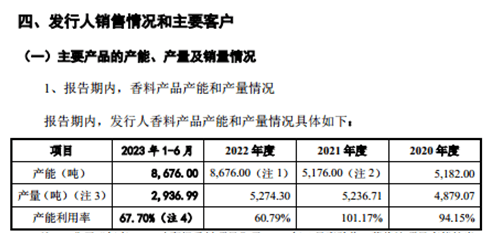 需要指出的是,格林生物上述产品的产能利用率却在大幅下滑。报告期内,格林生物香料产品的产能利用率分别为94.15%、101.17%、60.79%、67.7%。