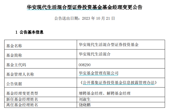 红星资本局10月23日消息,10月21日,华安基金公告,因内部调整,饶晓鹏离任华安现代生活混合,新任基金经理为刘淑生,任职日期为10月23日。