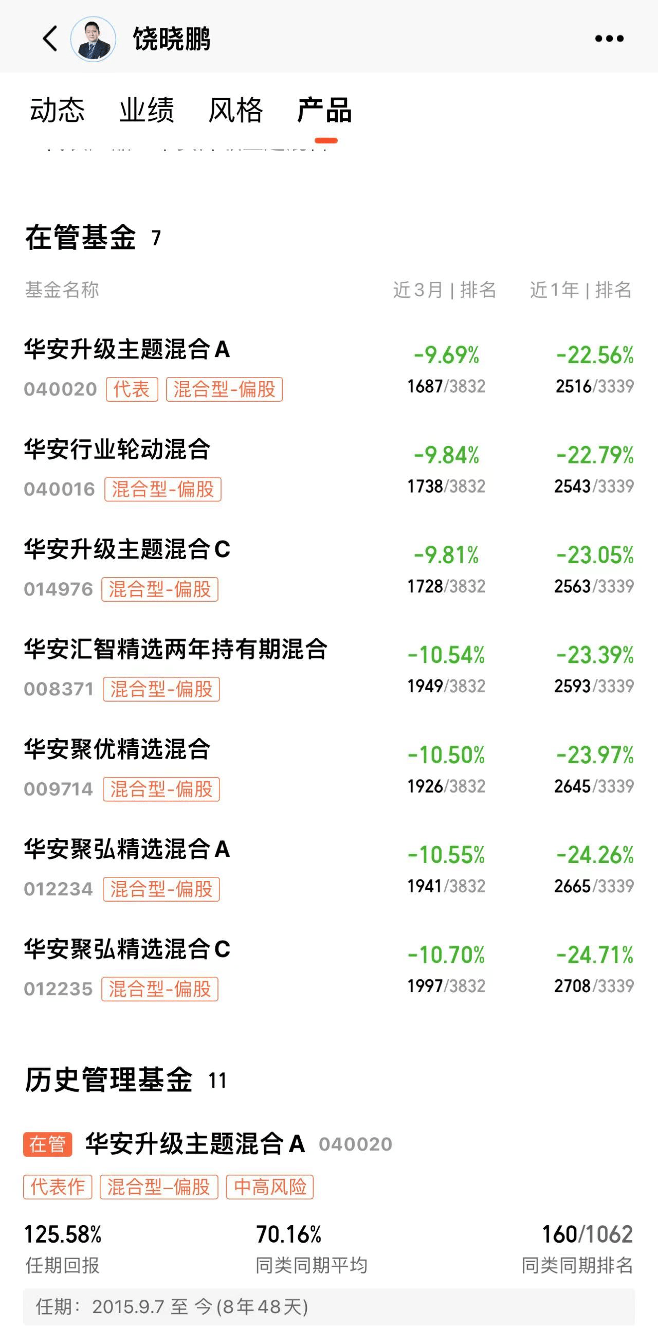 除了华安现代生活混合,饶晓鹏目前在管的7只基金近期表现也难言理想。天天基金网显示,截至10月20日,这7只基金近一年净值跌幅均超过20%。