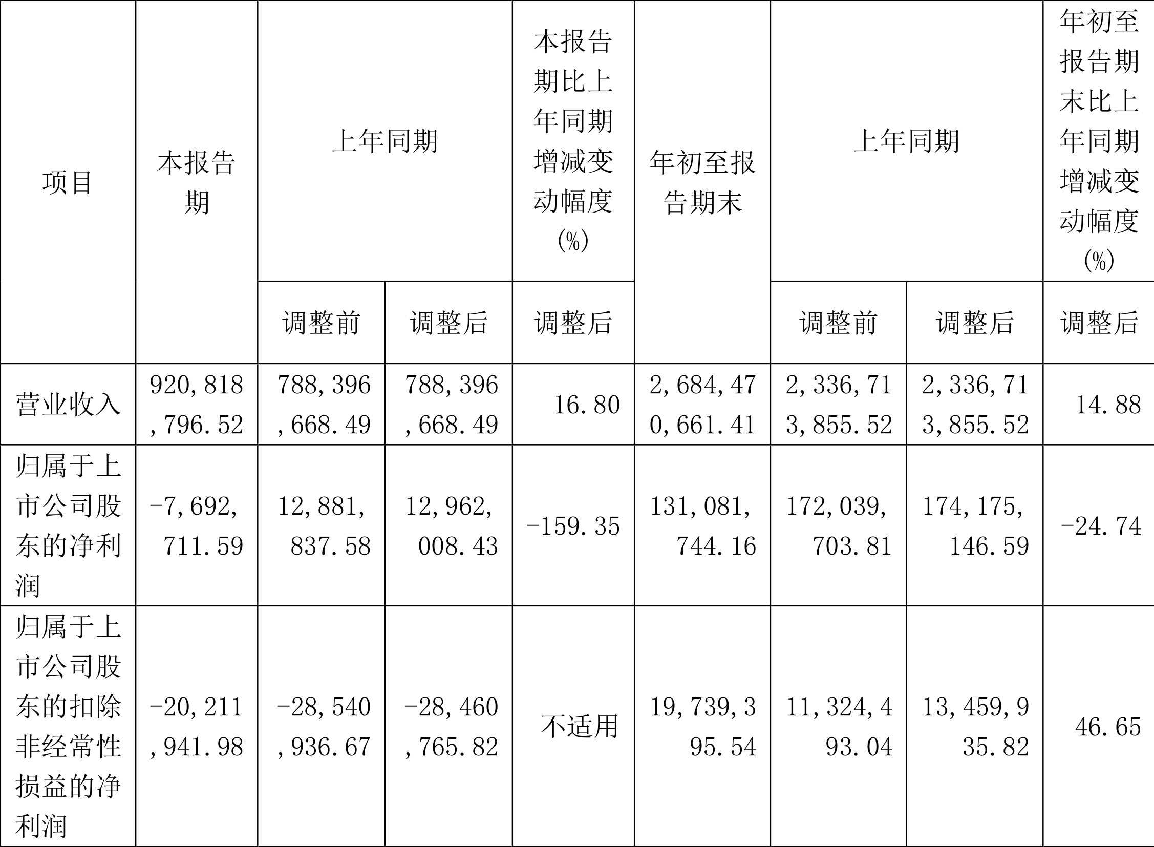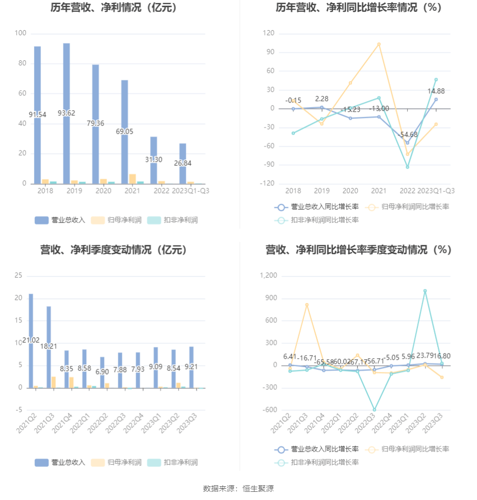 根据三季报,公司第三季度实现营业总收入9.21亿元,同比增长16.80%,环比增长7.80%;归母净利润-769.27万元,同比下降159.35%,环比下降106.81%;扣非净利润-2021.19万元,同比增长28.98%,环比下降176.13%。
