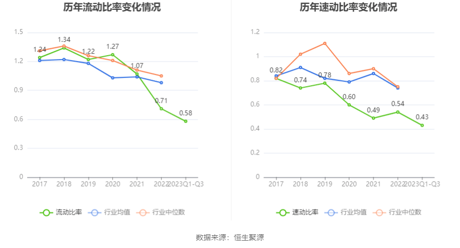 2023年前三季度,公司流动比率为0.58,速动比率为0.43。