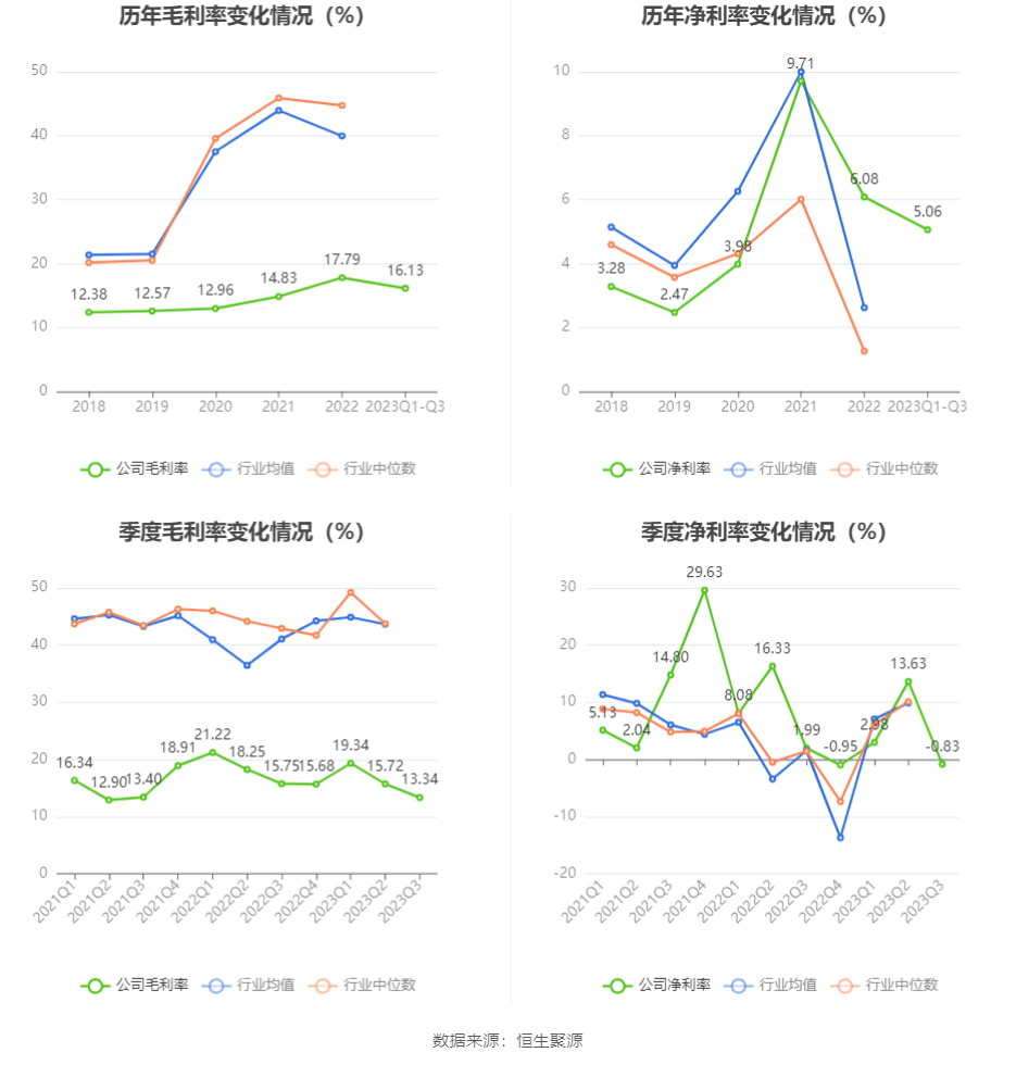 2023年前三季度,公司毛利率为16.13%,同比下降2.37个百分点;净利率为5.06%,较上年同期下降3.40个百分点。从单季度指标来看,2023年第三季度公司毛利率为13.34%,同比下降2.41个百分点,环比下降2.38个百分点;净利率为-0.83%,较上年同期下降2.82个百分点,较上一季度下降14.46个百分点。