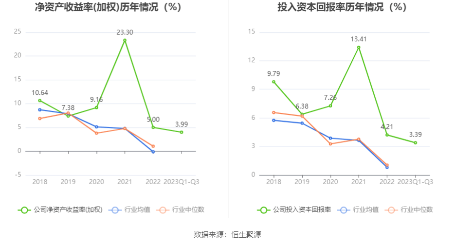 数据显示,2023年前三季度公司加权平均净资产收益率为3.99%,较上年同期增长0.73个百分点;公司2023年前三季度投入资本回报率为3.39%,较上年同期下降0.88个百分点。