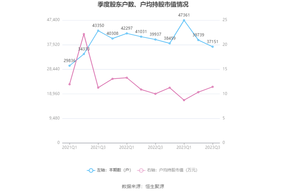 筹码集中度方面,截至2023年三季度末,公司股东总户数为3.72万户,较上半年末下降了2588户,降幅6.51%;户均持股市值由上半年末的10.35万元上升至11.43万元,增幅为10.43%。