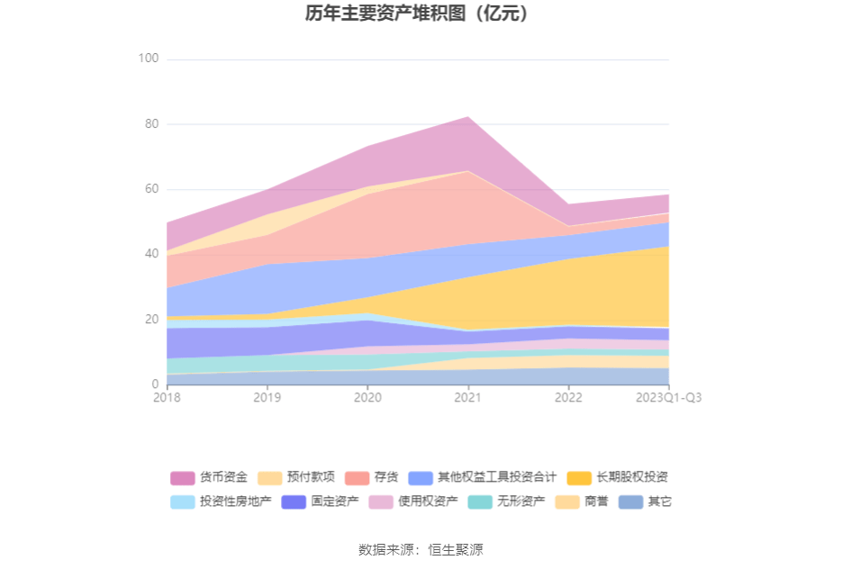 资产重大变化方面,截至2023年三季度末,公司长期股权投资较上年末增加22.50%,占公司总资产比重上升5.90个百分点;货币资金较上年末减少16.36%,占公司总资产比重下降2.47个百分点;应收账款较上年末增加82.57%,占公司总资产比重上升1.17个百分点;其他应收款(含利息和股利)较上年末减少69.34%,占公司总资产比重下降0.76个百分点。