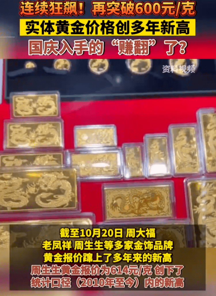 据证券时报报道,截至10月20日,周大福、老凤祥、周生生等多家知名金饰品牌的黄金报价蹿上了多年来的新高。以周生生为例,10月20日周生生黄金报价为614元/克,创下了统计口径(2010年至今)内的新高。