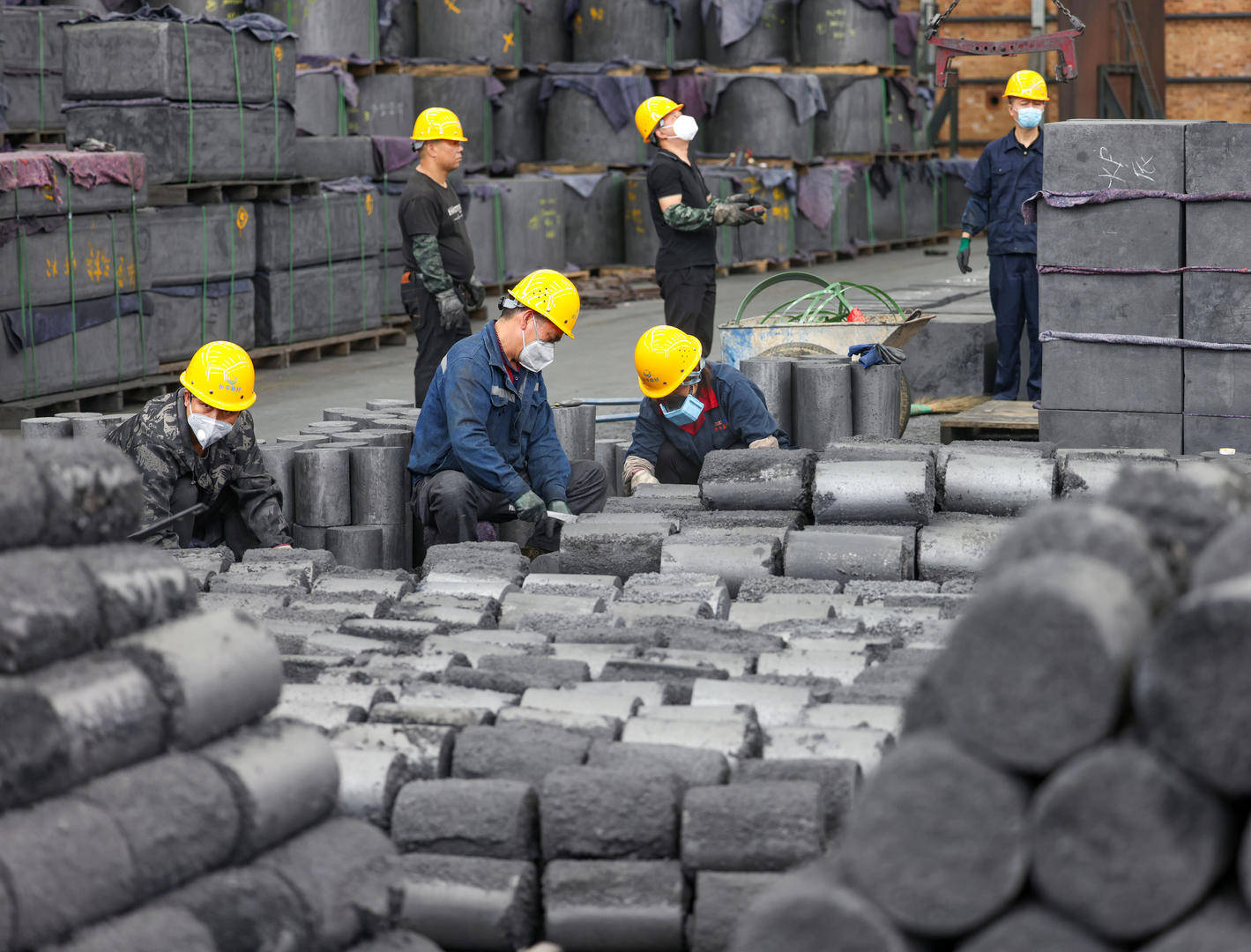 ▲贵州黔东南一家新材料生产企业的工人在打磨石墨化成品。