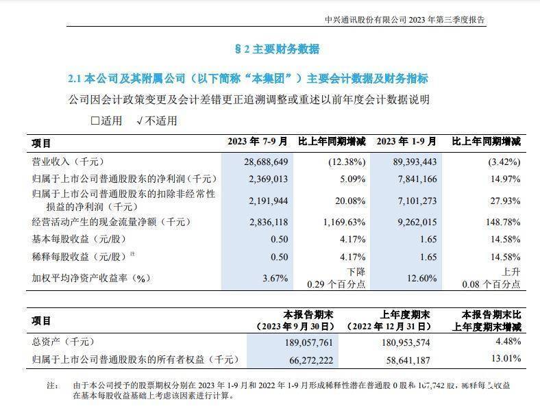 10月23日晚间,中兴通讯发布2023年三季报。报告显示,中兴通讯2023年前三季度营收893.93亿元,同比下降3.42%;归母净利润78.41亿元,同比增长14.97%。其中,第三季度营业收入286.89亿元,同比下降12.38%;归母净利润23.69亿元,同比增长5.09%。