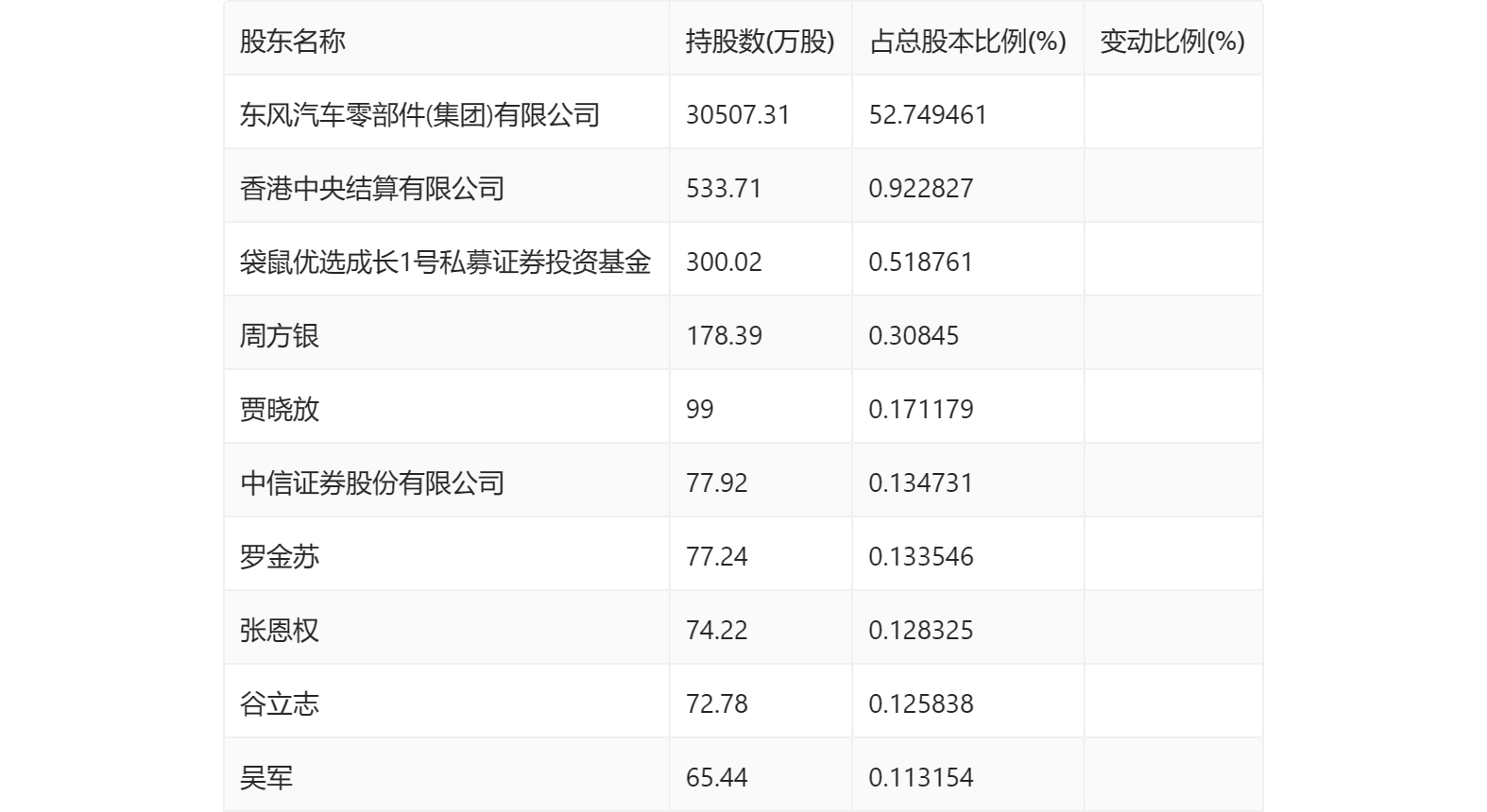 三季报显示,2023年三季度末的公司十大流通股东中,新进股东为香港中央结算有限公司、中信证券股份有限公司、罗金苏、张恩权、谷立志、吴军。在具体持股比例上,东风汽车零部件(集团)有限公司、周方银、贾晓放持股有所上升,袋鼠优选成长1号私募证券投资基金持股有所下降。