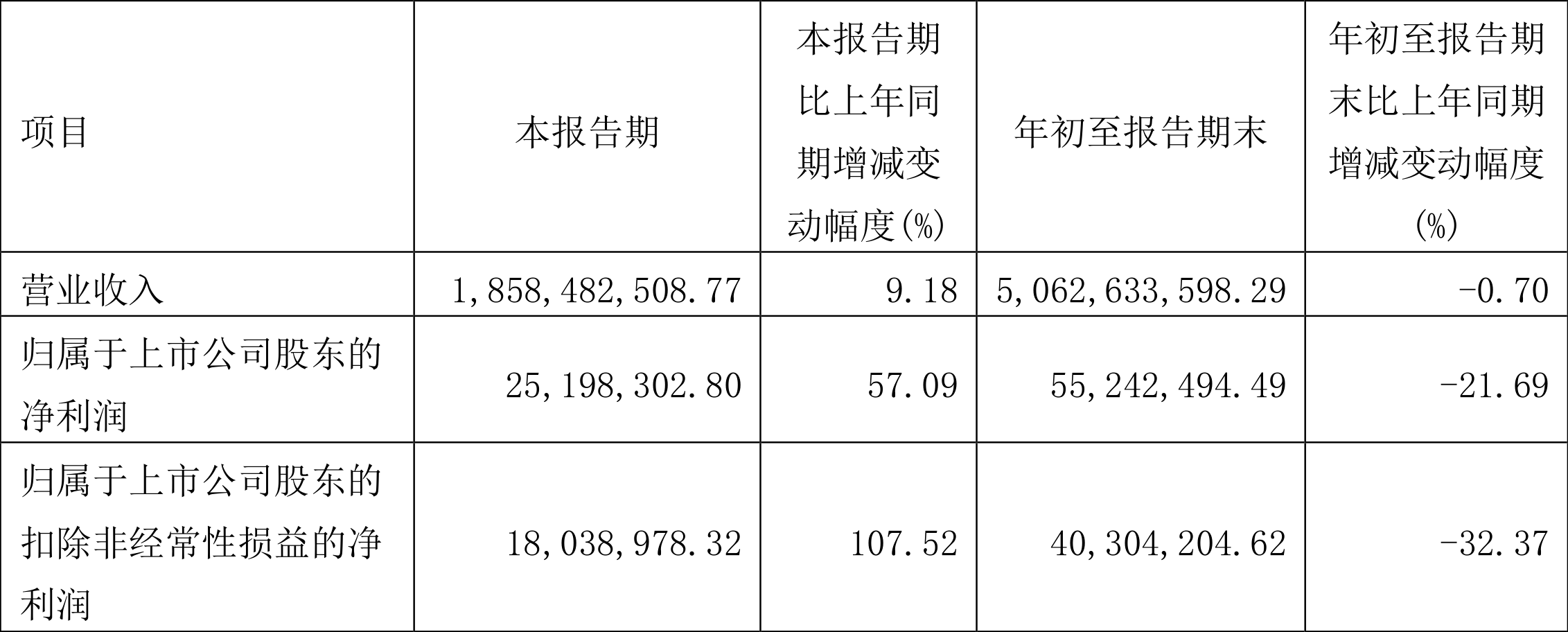 根据三季报,公司第三季度实现营业总收入18.58亿元,同比增长9.18%,环比增长8.93%;归母净利润2519.83万元,同比增长57.09%,环比增长30.04%;扣非净利润1803.9万元,同比增长107.52%,环比增长20.86%。