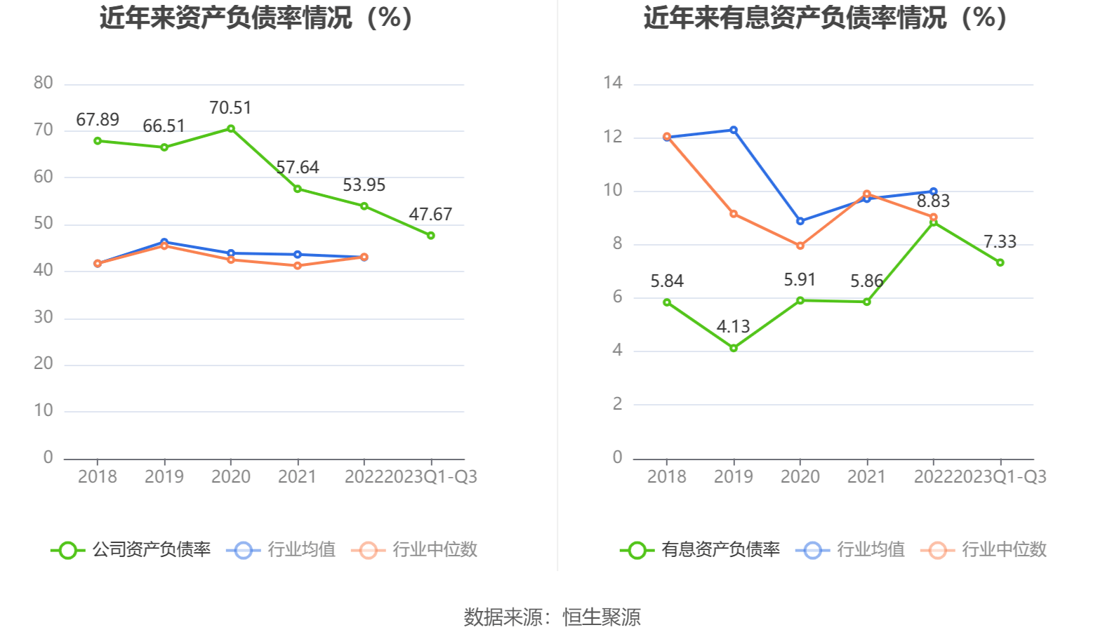 在偿债能力方面,公司2023年三季度末资产负债率为47.67%,相比上年末下降6.28个百分点;有息资产负债率为7.33%,相比上年末下降1.50个百分点。