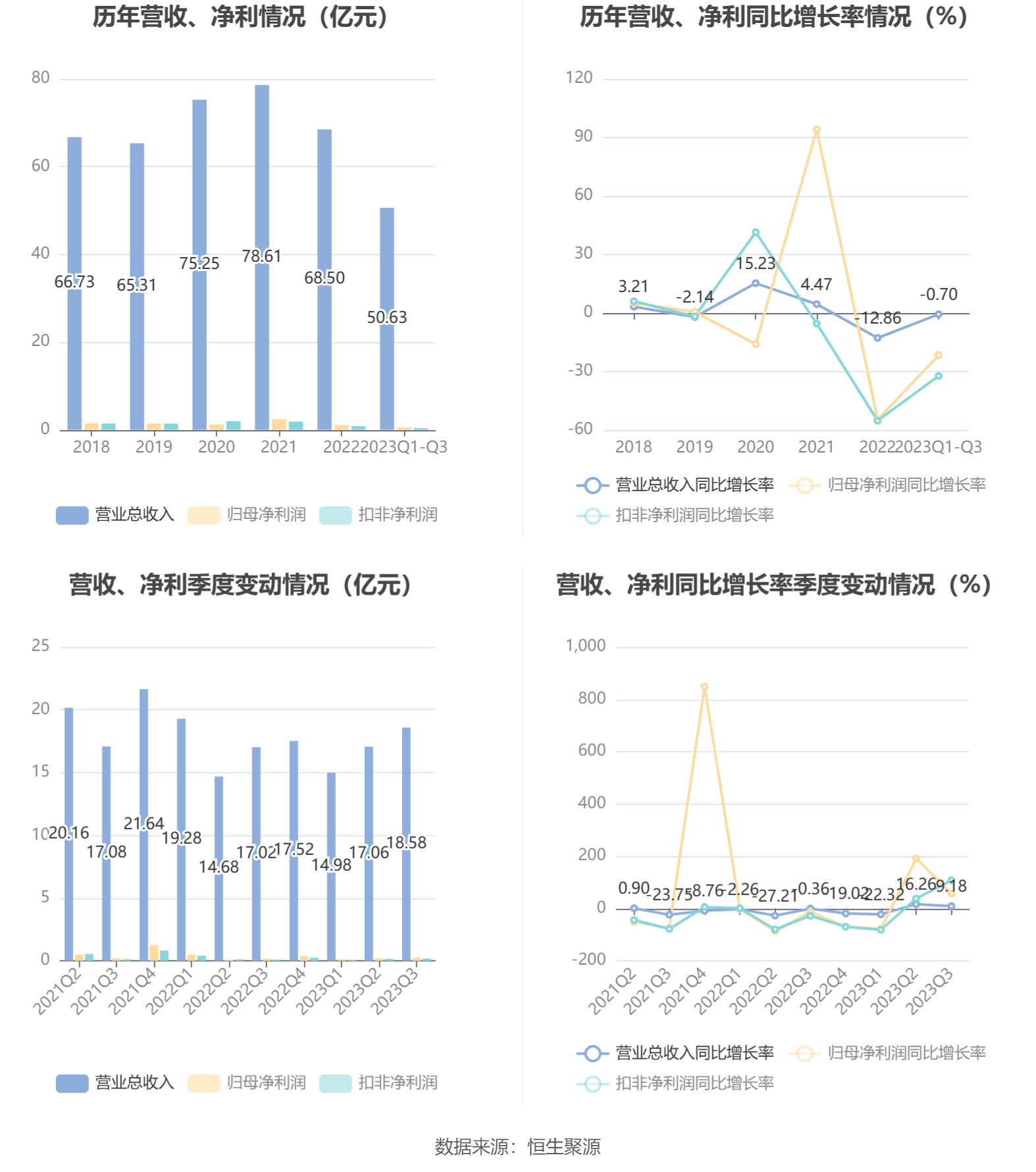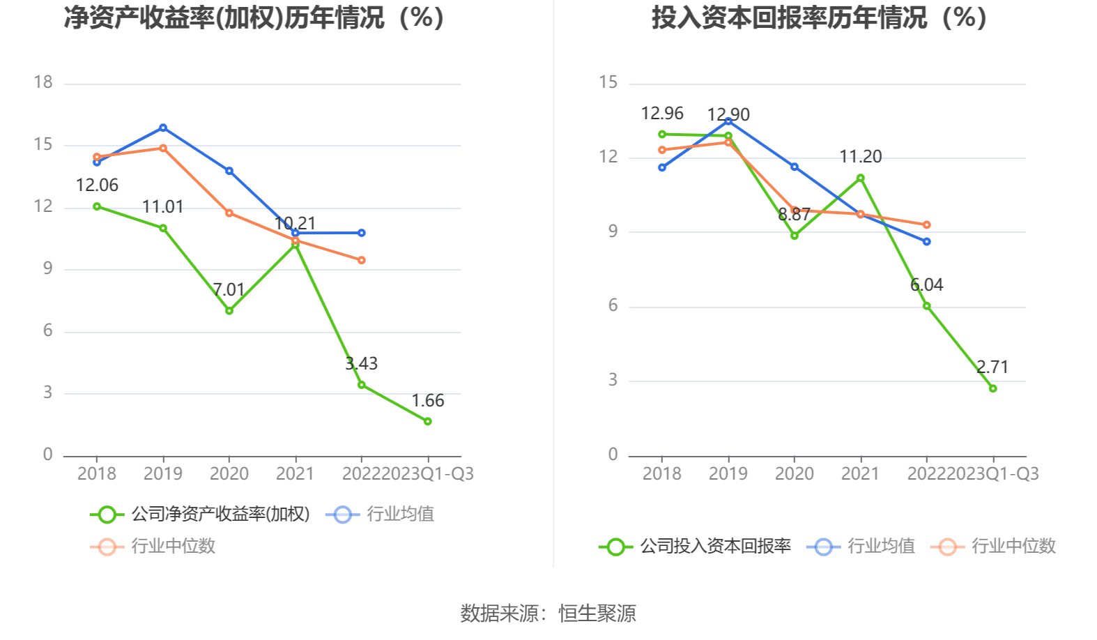 数据显示,2023年前三季度公司加权平均净资产收益率为1.66%,较上年同期下降0.56个百分点;公司2023年前三季度投入资本回报率为2.71%,较上年同期下降1.08个百分点。