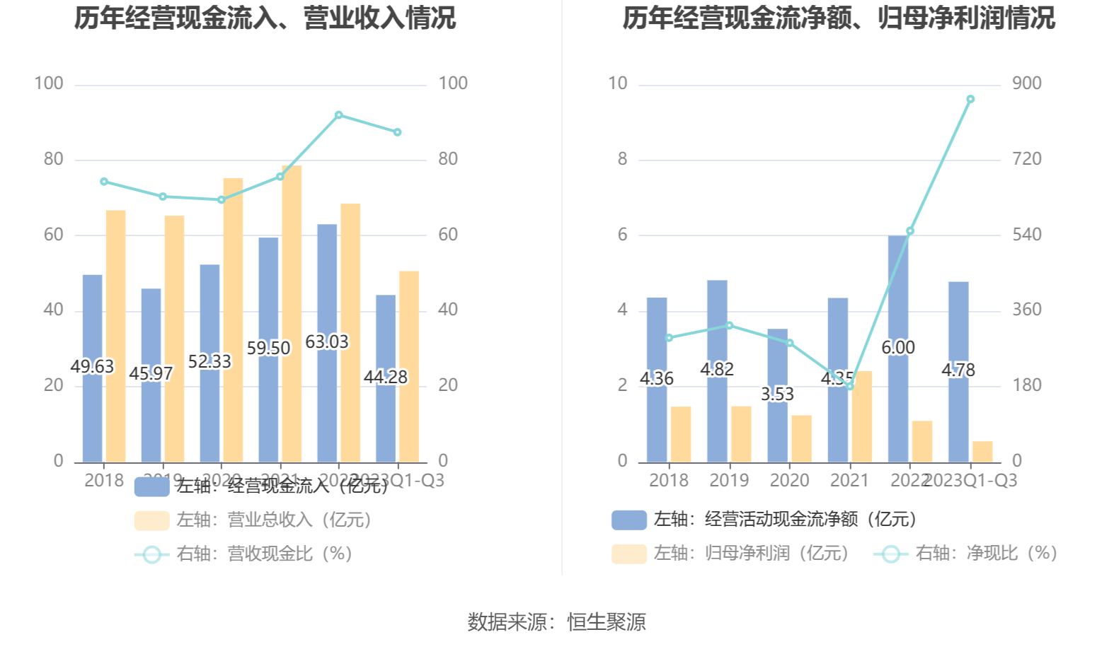 2023年前三季度,公司营业收入现金比为87.46%,净现比为866.12%。