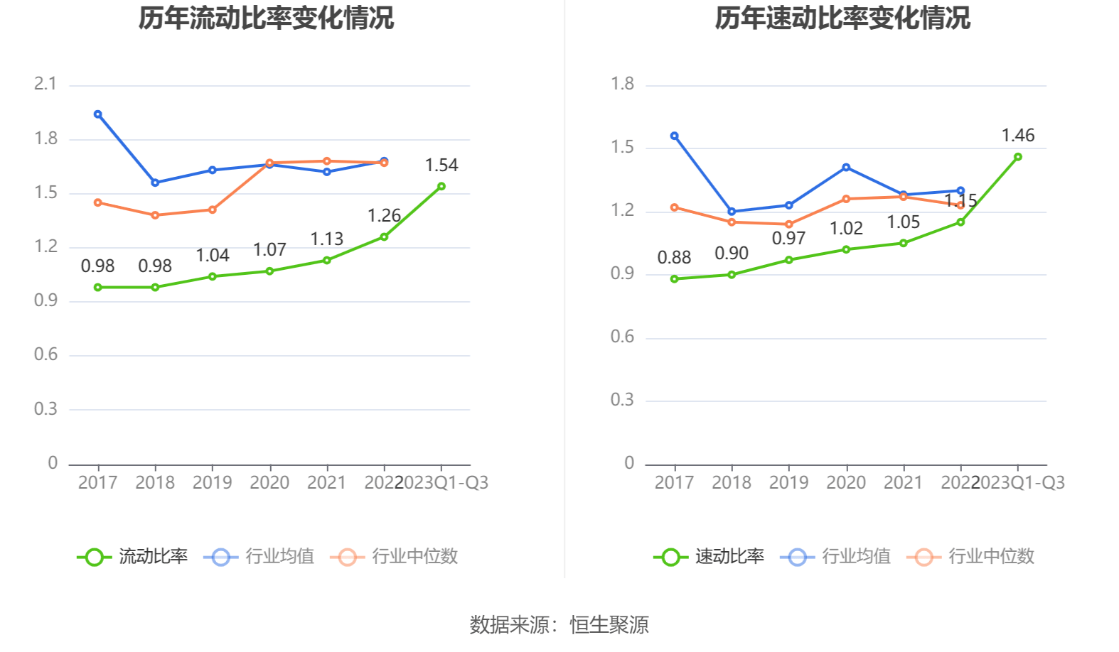 2023年前三季度,公司流动比率为1.54,速动比率为1.46。