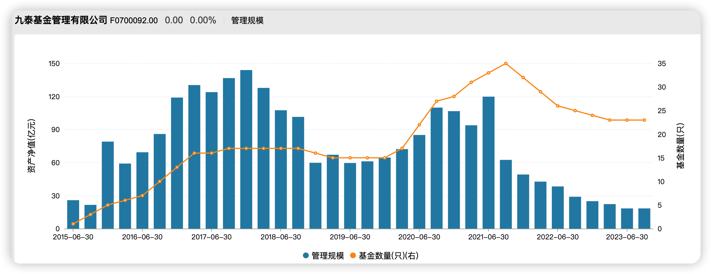 截至2023年三季度末,九泰基金的管理规模已大幅缩水,只有18.36亿元,但基金数量却增加到了23只。