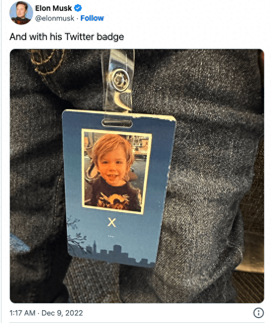 随即他还晒出了一张X的推特工卡照片,上面是儿子的头像,并简单地写了一个“X”,下面是这个两岁孩子在公司的职位,不过用了“...”代替,应该是还没想好他能干什么的意思。