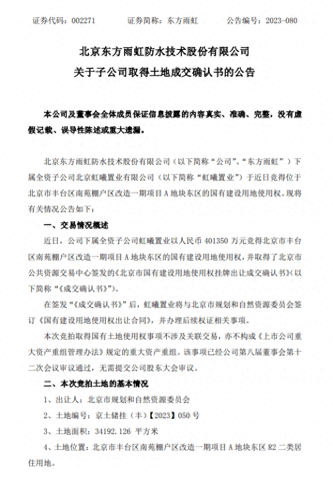 近日,一直拿地失败的东方雨虹终于竞拍下了自己的地,10月19日晚间,东方雨虹发布公告,关于自己子公司北京虹曦置业有限公司(以下简称“虹曦置业”)于近日竞得位于北京市丰台区南苑棚户区改造一期项目 A 地块东区的国有建设用地使用权,并取得了北京市公共资源交易中心签发的成交确认书,土地价款约为40.14亿元。