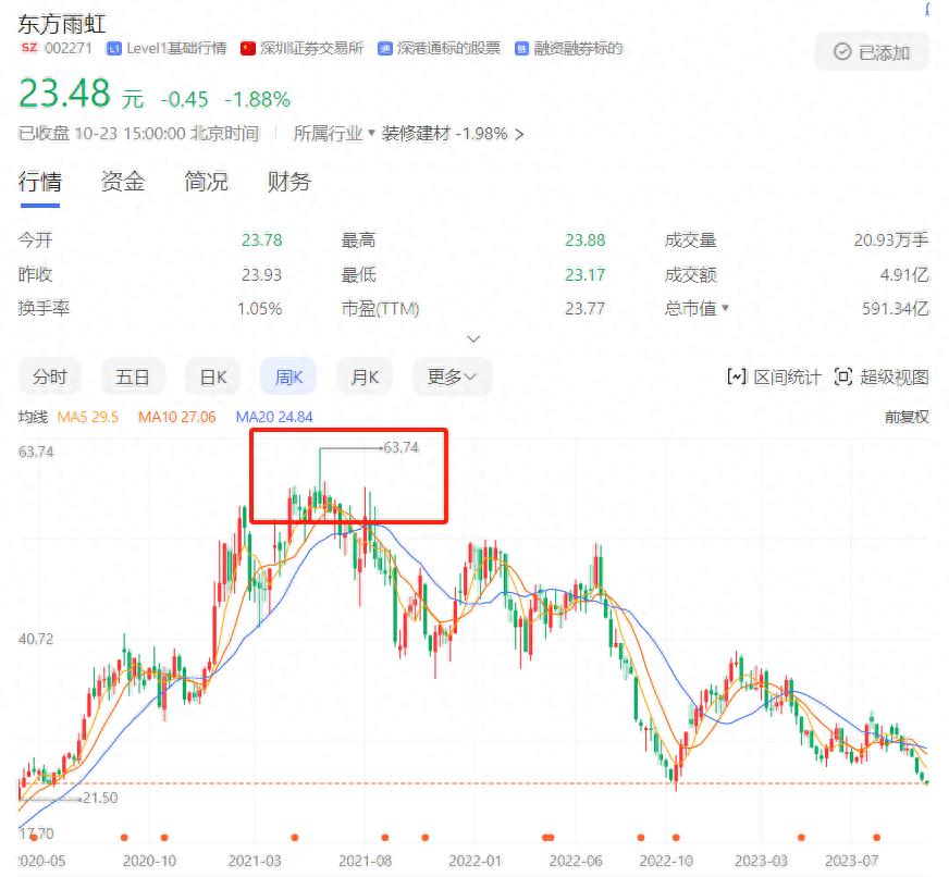而在业绩下降的同时,公司的股价也是一度大跌,公司在2021年6月1日,曾经股价最高涨至64.14元/股,市值达1618.89亿元。此后,公司的股价一路下跌,尤其是,去年7月份到10月份这个区间,公司基本上是没有“抵抗性”的下跌,最低的时候跌至22.61元/股。而后,股价到今年1月份又有所回升,涨到了39.50元/股,随后股价继续下跌,到了今日收盘,公司的股价已经又跌至23.48元/股,市值仅剩下591亿元左右,比起巅峰时期,蒸发超过千亿。