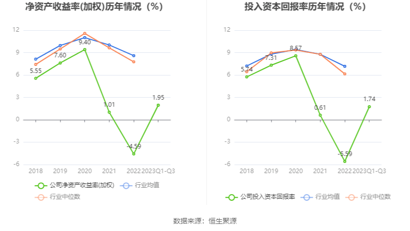 数据显示,2023年前三季度公司加权平均净资产收益率为1.95%,较上年同期增长2.97个百分点;公司2023年前三季度投入资本回报率为1.74%,较上年同期增长3.23个百分点。