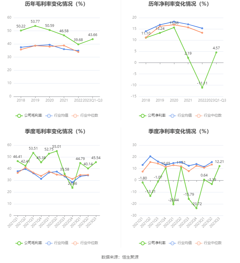2023年前三季度,公司毛利率为43.66%,同比下降5.15个百分点;净利率为4.57%,较上年同期上升8.49个百分点。从单季度指标来看,2023年第三季度公司毛利率为45.54%,同比上升9.96个百分点,环比上升5.40个百分点;净利率为12.21%,较上年同期上升28.00个百分点,较上一季度上升15.40个百分点。