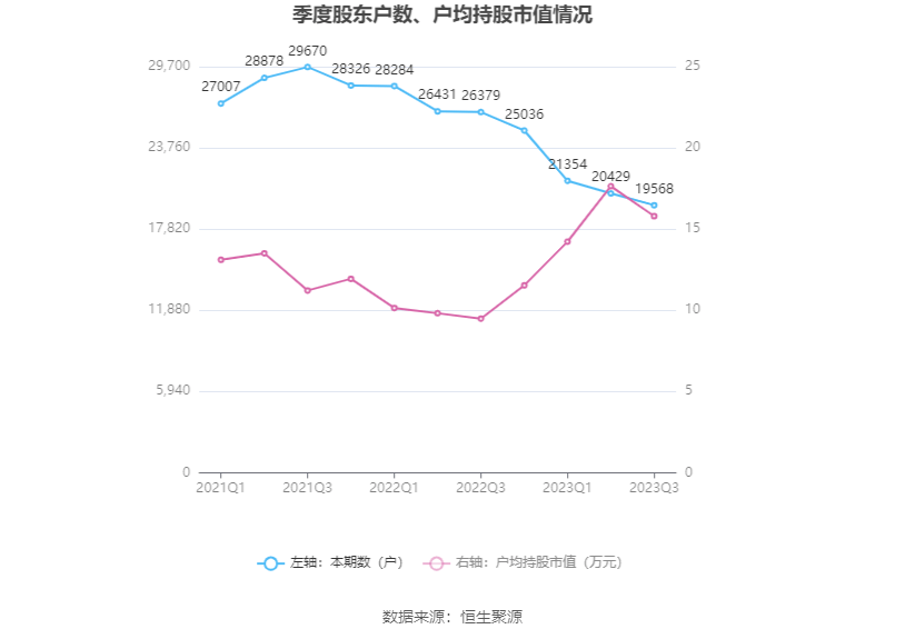 筹码集中度方面,截至2023年三季度末,公司股东总户数为1.96万户,较上半年末下降了861户,降幅4.21%;户均持股市值由上半年末的17.64万元下降至15.80万元,降幅为10.43%。
