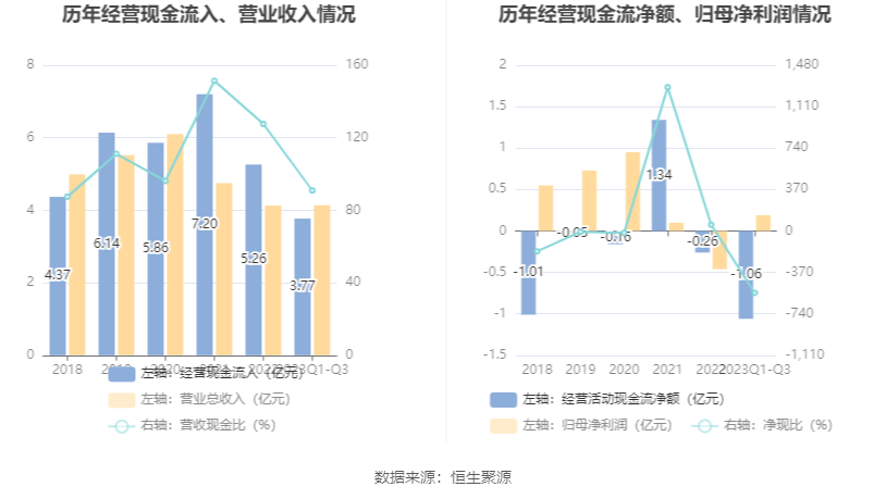 2023年前三季度,公司经营活动现金流净额为-1.06亿元,同比减少1909.51万元;筹资活动现金流净额8992.54万元,同比增加1.12亿元;投资活动现金流净额-988.96万元,上年同期为-580.21万元。