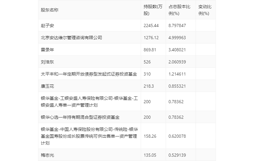 三季报显示,2023年三季度末公司十大流通股东中,新进股东为银华心选一年持有期混合型证券投资基金、银华基金-中国人寿保险股份有限公司-传统险-银华基金国寿股份成长股票传统可供出售单一资产管理计划,取代了上半年末的MORGAN STANLEY & CO. INTERNATIONAL PLC.、华夏银行股份有限公司-华夏智胜先锋股票型证券投资基金(LOF)。在具体持股比例上,太平丰和一年定期开放债券型发起式证券投资基金、康玉花、银华基金-工银安盛人寿保险有限公司-银华基金-工银安盛人寿单一资产管理计划、梅志光持股有所上升。