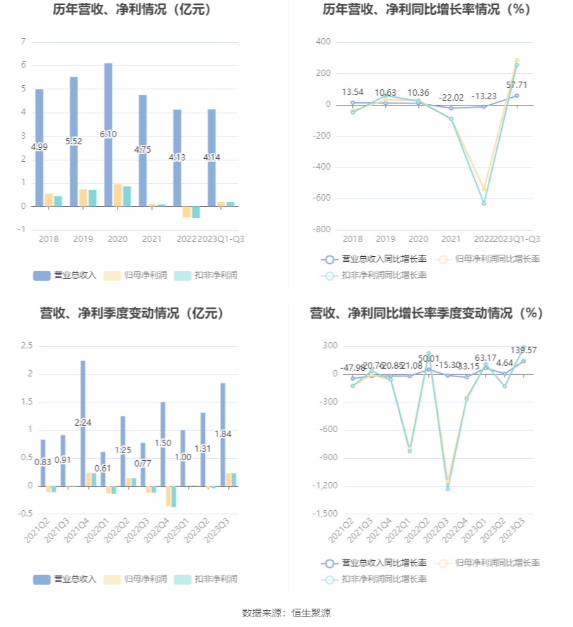 根据三季报,公司第三季度实现营业总收入1.84亿元,同比增长139.57%,环比增长40.89%;归母净利润2264.69万元,同比增长286.90%,环比增长643.44%;扣非净利润2261.8万元,同比增长288.11%,环比增长639.62%。
