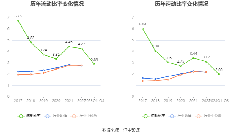 2023年前三季度,公司流动比率为2.89,速动比率为2.00。