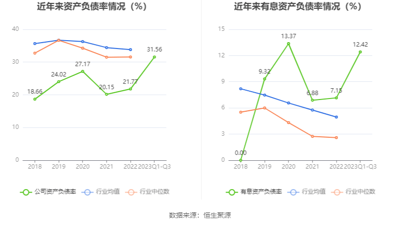 在偿债能力方面,公司2023年三季度末资产负债率为31.56%,相比上年末上升9.79个百分点;有息资产负债率为12.42%,相比上年末上升5.27个百分点。