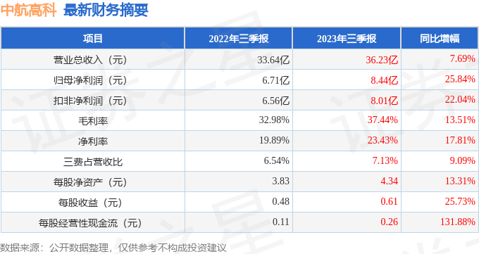 据证券之星公开数据整理,近期中航高科(600862)发布2023年三季报。根据财报显示,本报告期中中航高科营收净利润双双增长,盈利能力上升。截至本报告期末,公司营业总收入36.23亿元,同比上升7.69%,归母净利润8.44亿元,同比上升25.84%。按单季度数据看,第三季度营业总收入12.1亿元,同比上升13.67%,第三季度归母净利润2.93亿元,同比上升50.06%。