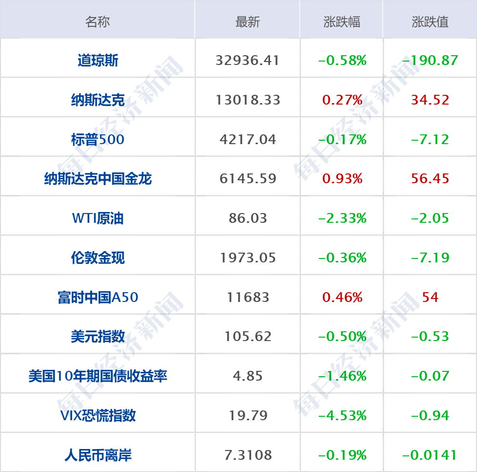美股三大指数收盘涨跌不一,道指跌0.58%,纳指涨0.27%,标普500指数跌0.17%。热门科技股多数上涨,ARM涨近5%,英伟达涨超3%,亚马逊、Meta涨超1%。锂电池、石油与天然气板块跌幅居前,雪佛龙、西方石油跌超3%,康菲石油、智利矿业化工跌超2%。热门中概股多数上涨,纳斯达克中国金龙指数涨0.93%。小鹏汽车涨超3%,腾讯音乐涨超2%,理想汽车、京东、拼多多涨超1%,哔哩哔哩、百度、阿里巴巴、网易、蔚来小幅上涨。
