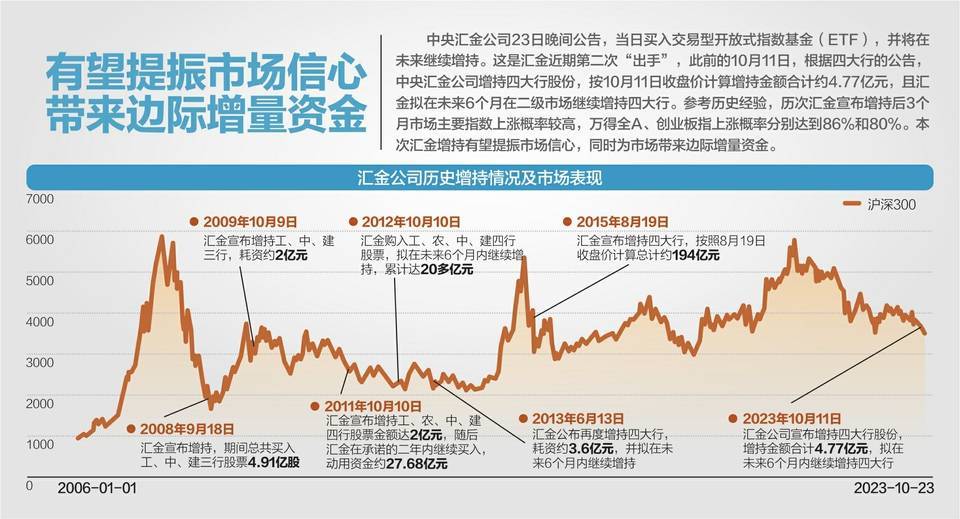 23日晚间,中央汇金公司发布公告,当日买入交易型开放式指数基金(ETF),并将在未来继续增持。这已是汇金公司本月第二次出手。此前的10月11日,根据四大行的公告,中央汇金公司增持四大行股份,按10月11日收盘价计算增持金额合计约4.77亿元,且汇金拟在未来6个月在二级市场继续增持四大行。
